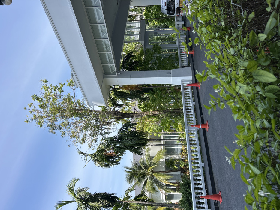 The image depicts an outdoor daytime scene at what appears to be the entrance or drop-off point of a resort or large building complex in Phuket City Municipality, Thailand. The scene features a large, white, multi-columned portico extending over a paved, dark asphalt driveway that curves from the foreground towards the right. A low, white balustrade with ornate spindles runs along the left edge of the driveway. Six orange traffic cones are deployed on the asphalt, with three visible on the left side of the driveway and three on the right, one partially obscured by foreground vegetation. The immediate foreground shows out-of-focus green bushes with small white flowers. Numerous tall palm trees and other tropical trees with dense green foliage are prominent throughout the image, surrounding and partially obscuring a white multi-story building visible in the background on the left. The sky is clear blue with faint, wispy clouds. On the far right, beneath the white portico, a white passenger van or minibus is partially visible. The van has tinted windows, Thai script on its side, and a yellow license plate with "4858" as the final four digits. One individual is discernible inside the van, positioned in the passenger seat area. They are wearing a horizontally striped shirt (dark and light stripes) and dark sunglasses, appearing to look forward or slightly to the left. The van is stationary.