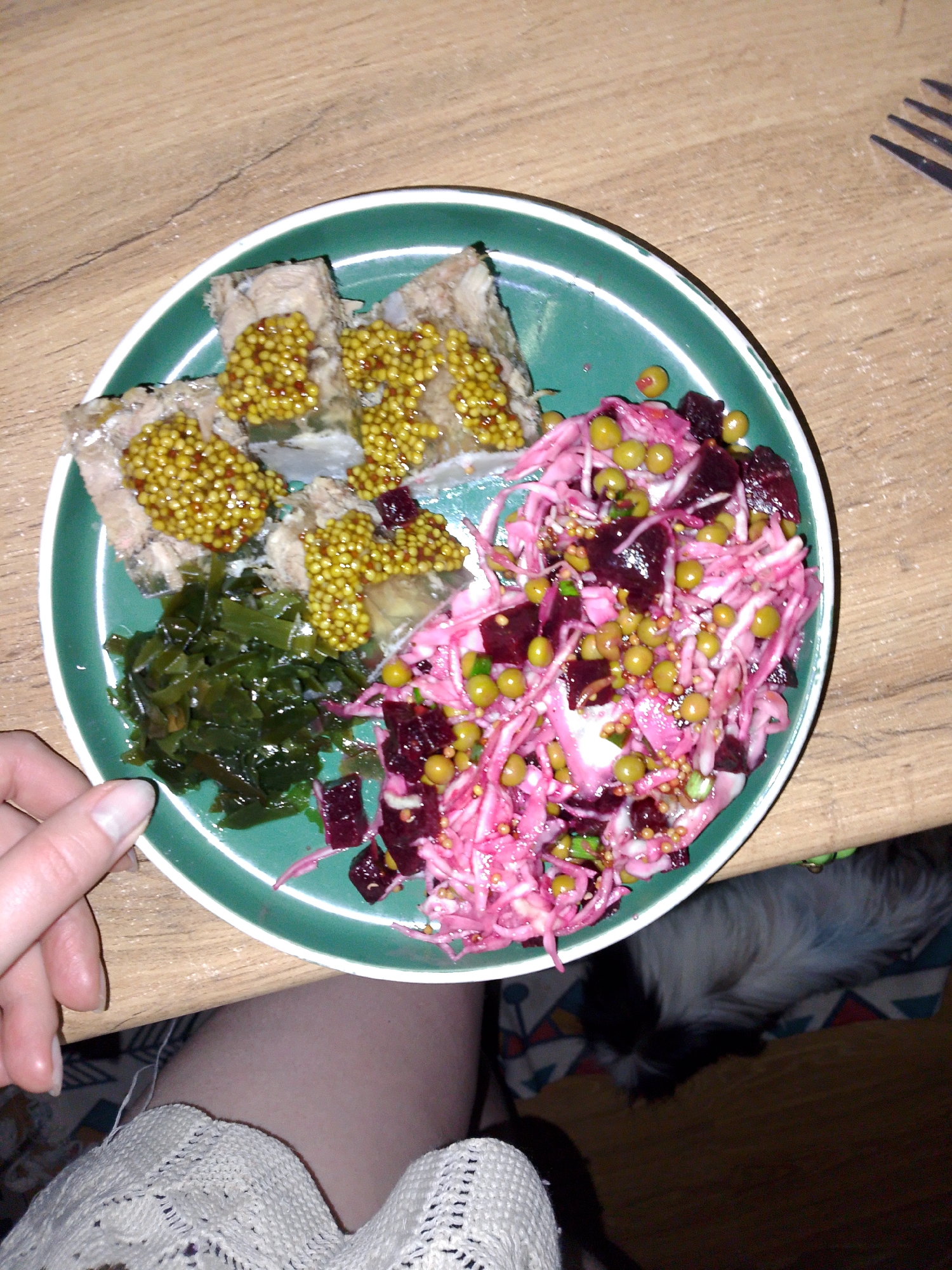 A plate of food rests on a wooden surface, presumably a table. The plate contains three separate dishes: meat covered in a clustered granular substance, dark green seaweed, and a salad with shredded pink cabbage, beetroot, and green peas. A hand is visible near the edge of the plate, and a fork is partially visible in the upper right corner. Below the table, a small dog rests on a patterned surface. There are no clear indications of the image being taken in Izhevsk, Russia.