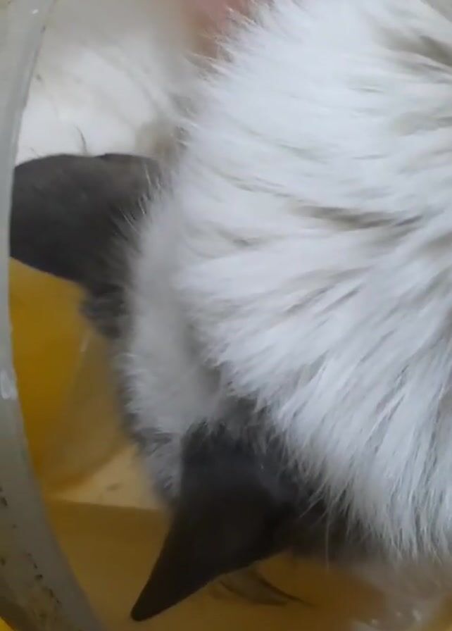 close-up of a cat's head inside what appears to be a plastic bowl or container with a yellow interior. The cat has predominantly white, fluffy fur with patches of dark grey or black, particularly around its ears and muzzle. The top of the container appears to be pink. The cat is still and quiet.