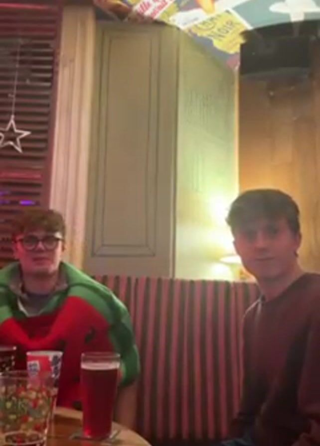 Two young men are seated at a round wooden table in a pub, seemingly engaged in a conversation. One of them is wearing glasses and a watermelon-patterned sweatshirt, while the other is in a dark red long-sleeved shirt and shorts. They both appear to be Caucasian. On the table are several glasses, including one filled with a dark red liquid, presumably a drink. The man in the red shirt lifts the glass and gestures, possibly proposing a toast or making a point in their conversation. The pub setting has a vibrant, eclectic style with a ceiling covered in vintage posters and various light fixtures. The background features striped wall decor and a vintage door-like structure with writing on it.