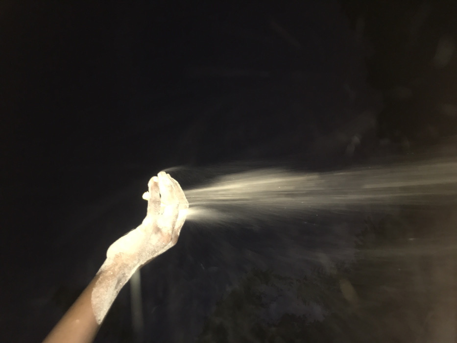 Against a dark background, a person's arm extends upwards, ending in a hand covered in white powder. More of this powder appears to be shooting horizontally from the fingers, creating a stream of particles. The lighting is dim, casting a spotlight effect on the hand and the dispersing powder, highlighting its texture.