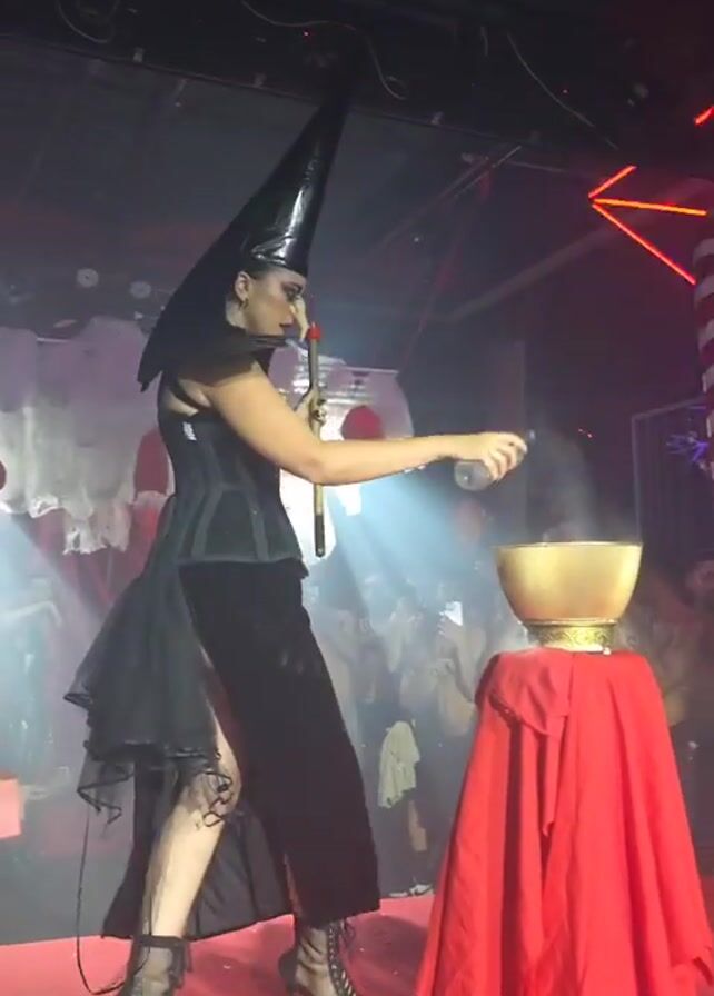 A person in costume is performing on a red stage. They are wearing a black corset, a long black skirt, and black lace-up heels. They also have a tall, pointed black hat. The person is pouring liquid from a bottle into a golden bowl on a stand draped with red fabric. They are holding a long wooden staff with a star on top. There is smoke coming from the bowl. In the background, there is a crowd of people, red balloons, and white fluffy decorations that look like clouds. The lighting is dim with spotlights shining on the performer.