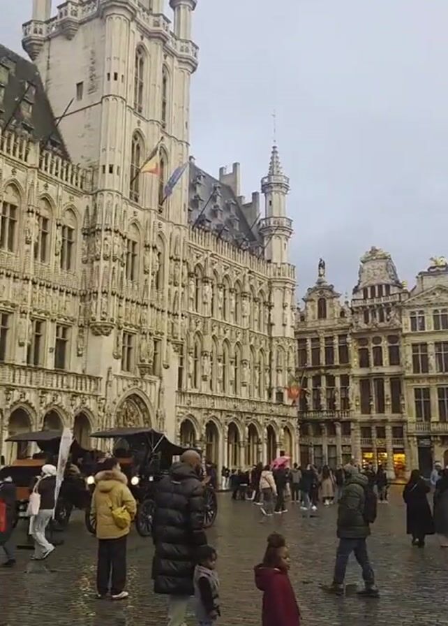 square filled with people, likely tourists, in front of a large, ornate, Gothic-style building. The ground is covered with cobblestones and appears wet. The sky is overcast. People are walking around, some are taking pictures, and others are simply looking at the architecture. A vintage-style car is parked near the building. The overall atmosphere seems calm and observant.