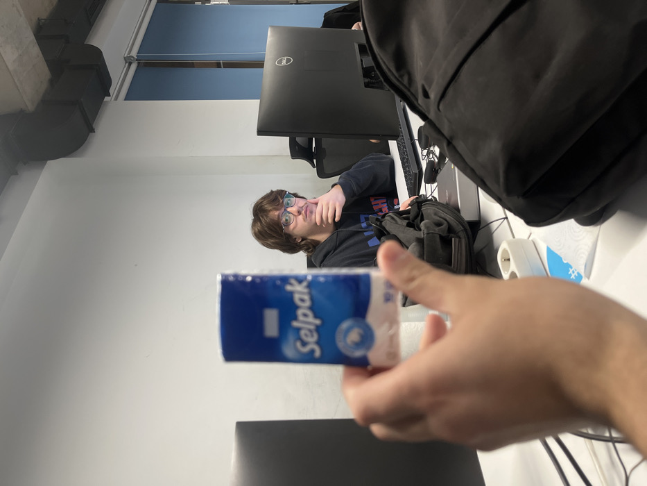 The image depicts an indoor office setting in Tbilisi, Georgia. In the foreground, a light-skinned hand holds a blue and white "Selpak" brand tissue packet, oriented vertically and slightly blurred. In the mid-ground, a young adult male with brown hair and eyeglasses is seated at a white desk. He is wearing a dark hooded sweatshirt and looking directly towards the viewer, with his left hand resting on his chin. To the left of the seated male, a partial black computer monitor is visible. To his right, a prominent black Dell computer monitor is positioned on the desk, with a black keyboard and mouse directly in front of it. A black backpack, a white power outlet, and various cables are also present on the desk surface. An obscured figure or object is partially visible behind the Dell monitor. The background consists of plain white walls. The ceiling features exposed concrete and black rectangular HVAC ducts. In the upper right corner, a window with blue roller blinds is visible next to a white structural pillar. The overall lighting is bright and even.