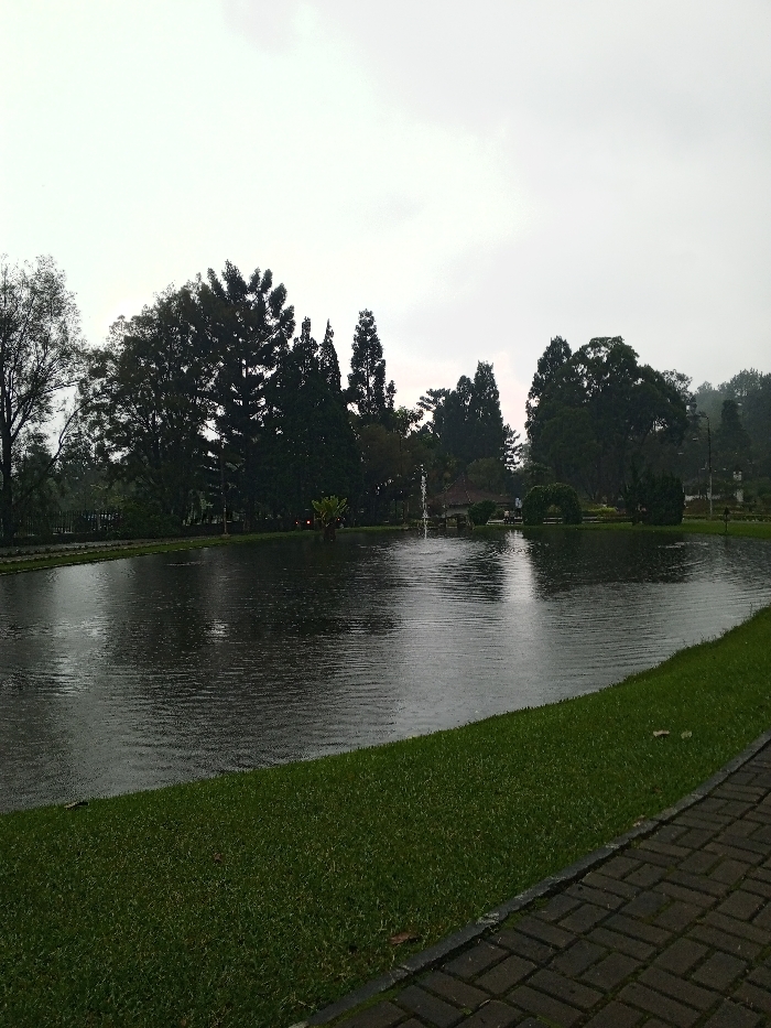 A tranquil pond fills the frame, its surface rippled by falling rain. Lush green trees line the far bank, their forms mirrored in the dark water. A small fountain erupts near the center. Manicured grass borders the pond's edge, meeting a paved brick walkway. The sky is overcast and gray.
