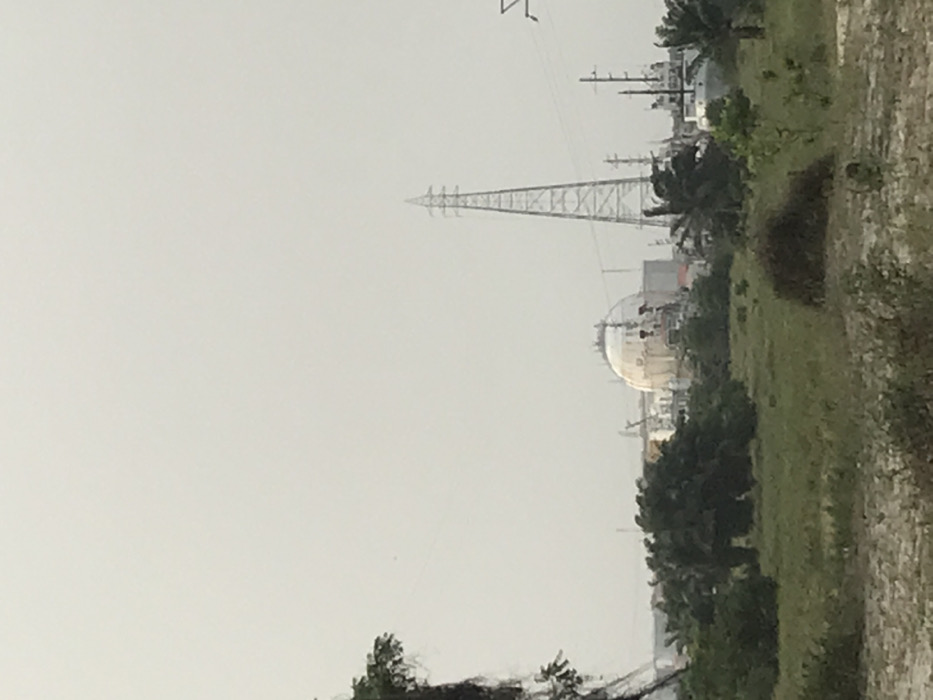 A landscape shot shows a power plant complex under an overcast sky. A spherical containment structure dominates the scene, with industrial buildings and power lines extending further back. Green vegetation lines the right side of the image, contrasting with the industrial infrastructure. An electrical transmission tower rises prominently in the middle distance. The overall impression is one of industrial activity set against a natural backdrop, albeit obscured by the weather.