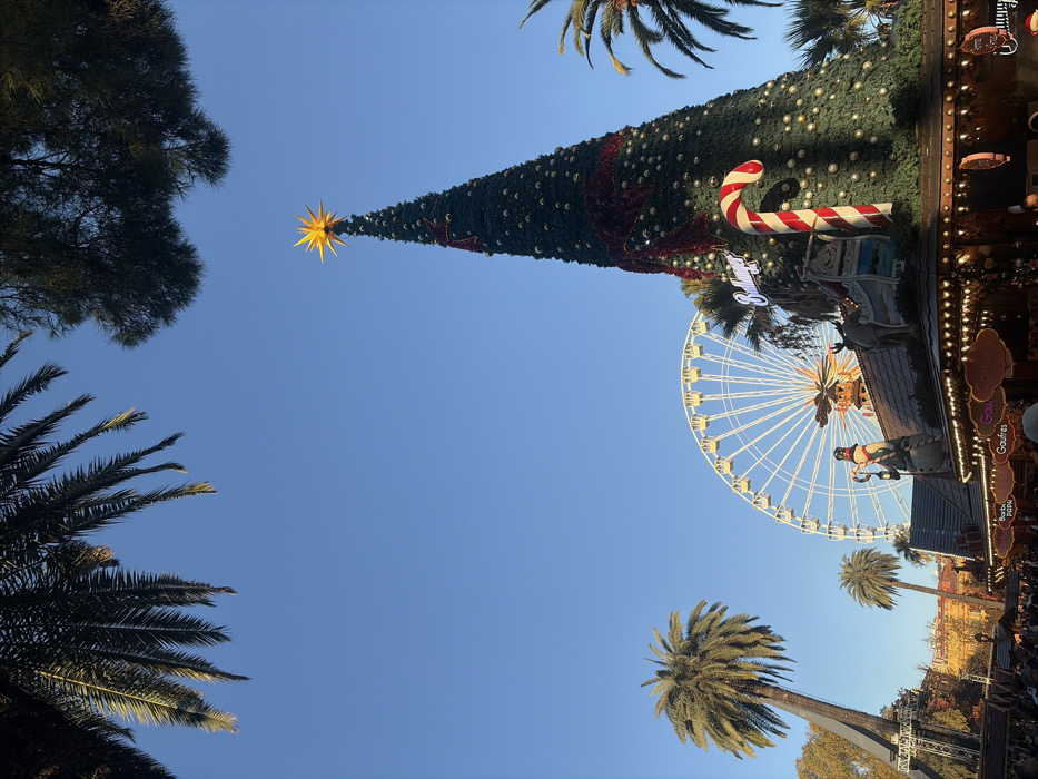 A tall Christmas tree with a star stands next to a ferris wheel in front of a blue sky. Palm trees and other foliage surround the scene. The tree is decorated with lights and a large candy cane. Buildings and crowds can be seen below the ferris wheel. The image is taken from a low angle, looking upwards.