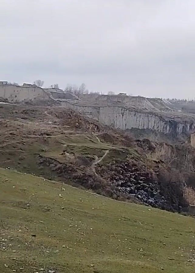 landscape on an overcast day. It pans across a green, grassy field towards a steep, eroded canyon with bare trees. The camera then transitions to a muddy, uneven dirt road with scattered patches of grass and standing water. Concrete poles, some supporting a rudimentary fence, line the side of the road. The sky remains consistently gray and overcast throughout the video. The scene lacks any human presence or activity.