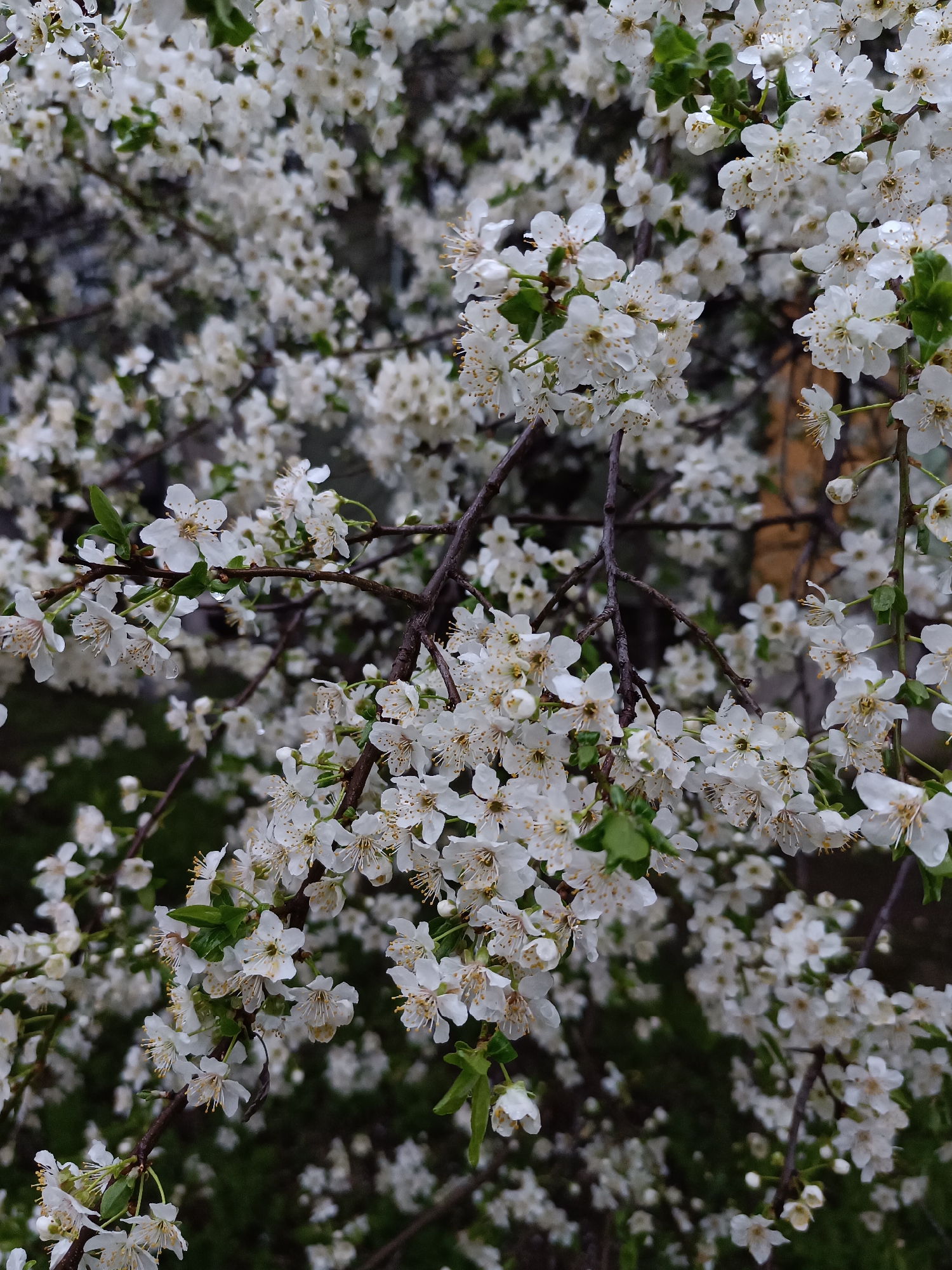Close-up photograph of a blossoming tree with white flowers and brown branches