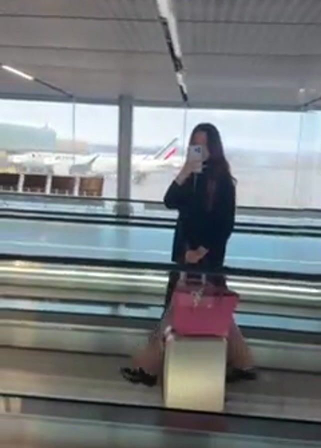 A woman is standing on a moving walkway in an airport. She is taking a selfie with her phone. She has a suitcase and a pink handbag. There is a large window behind her with an airplane visible in the background. She is dressed in a black coat and pink pants. The airport terminal appears modern and well-lit.