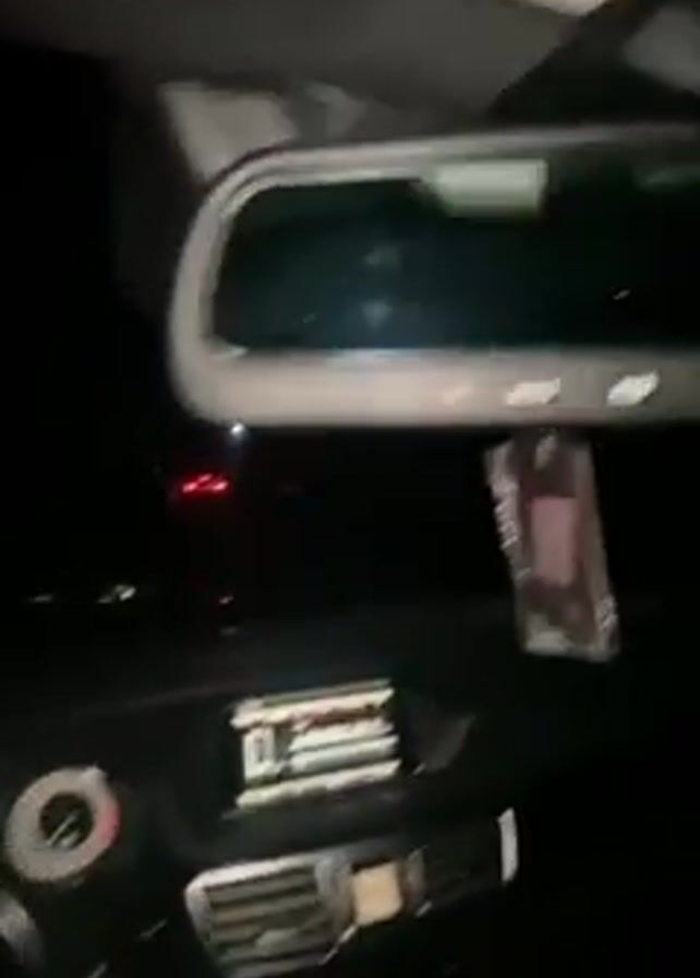 interior of a car at night. The camera starts focused on the steering wheel and dashboard of the car, which appears to be a Mercedes-Benz. Then it pans up to the rearview mirror and the ceiling of the car before showing a man with a beard sitting in the driver's seat, drinking from a cup. The lighting is dim, and the car appears to be stationary.