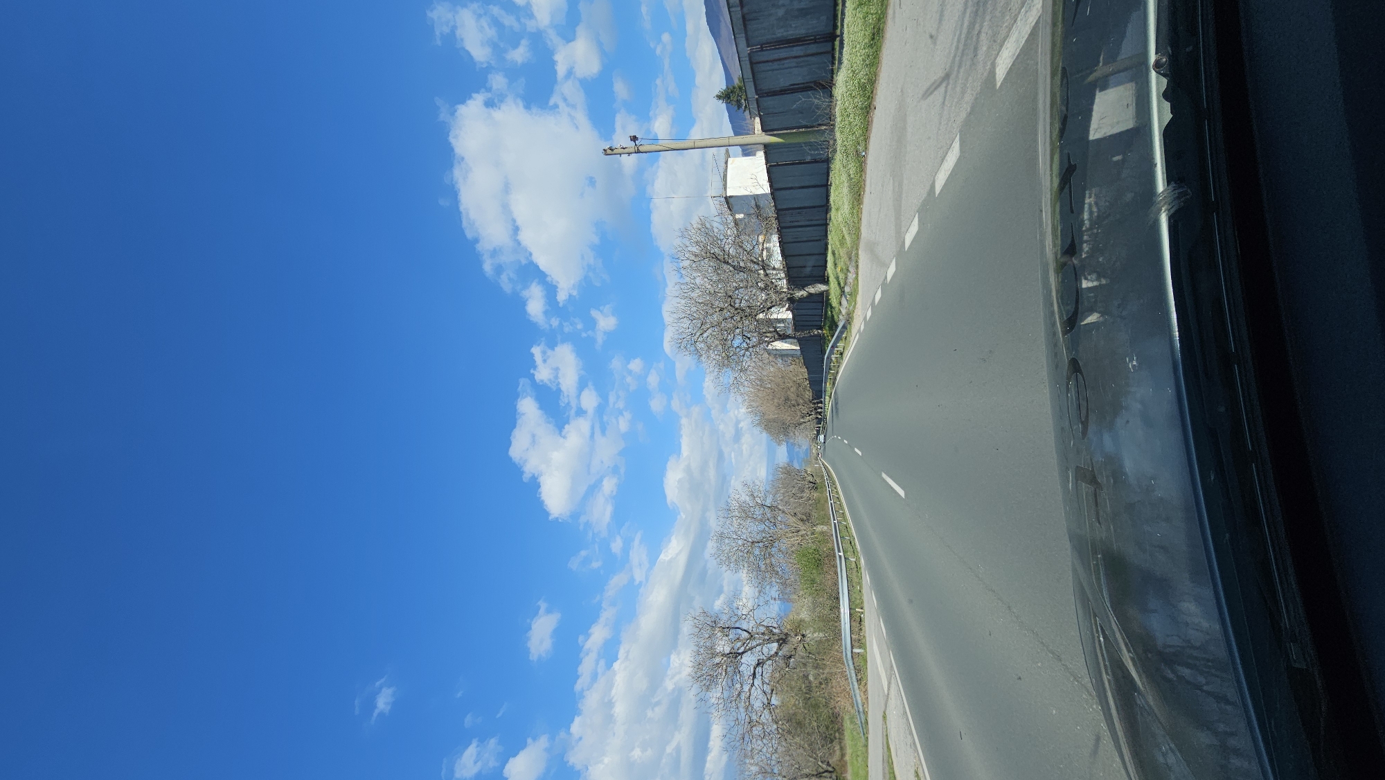 road in Iganovo, Bulgaria, viewed from inside a vehicle. The road stretches into the distance, flanked by trees and vegetation on one side and a building with a fence on the other. The sky is blue with scattered clouds. A utility pole is visible near the building. The foreground includes the vehicle's interior.