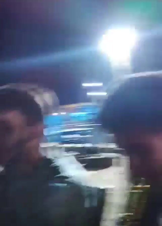 night-time beach scene with a group of people. At the start, a person is sitting at a table with cigarettes, a lighter, and a drink visible. The ocean is in the background with lights along the shoreline. The camera then quickly pans around showing several people, some with beards and glasses, and other blurry figures. It focuses on a hookah on the ground, then moves to a man standing by a table with items including a box of coconut charcoal. The environment appears to be sandy, and there are various objects scattered around the tables.