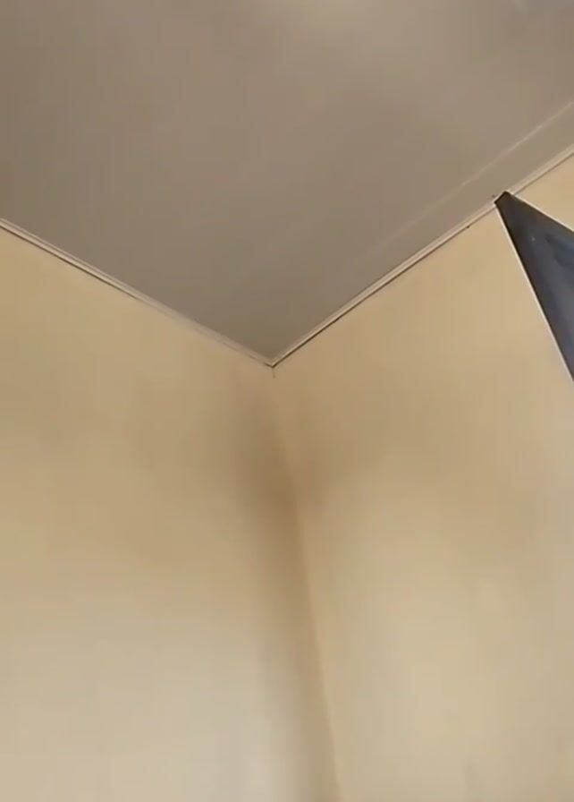 corner of a room with light beige walls and a gray ceiling. A thin white trim runs along the edges where the walls meet the ceiling. A small portion of a dark blue or black object hangs down from the upper right corner of the frame, partially obscuring the wall. The camera angle is looking up towards the corner.