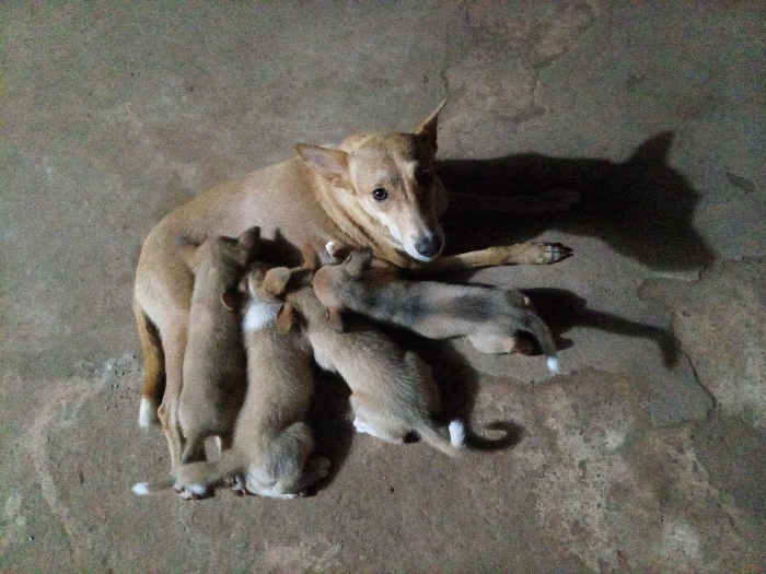 A light brown dog lies on a concrete floor, suckling its puppies. The mother dog looks directly at the camera with a calm expression. Four puppies cluster around her, their tiny bodies focused on nursing. The lighting casts a stark shadow of the dog behind her. The setting appears simple and utilitarian. The overall scene is peaceful, showcasing a moment of maternal care.