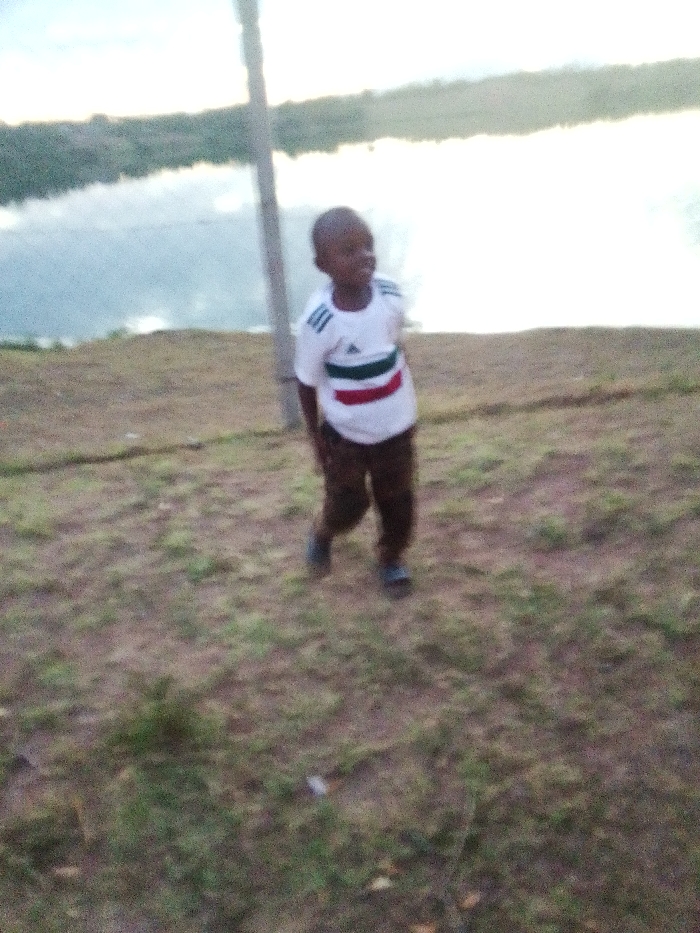 A blurry, grainy photograph captures a single young male child standing outdoors in Central Kasipul ward, Kenya. The child, appearing to be of early primary school age, has dark skin and short, dark hair. He is wearing a white t-shirt with a distinctive horizontal stripe pattern across the chest consisting of a green stripe, followed by a white stripe, and then a red stripe. He also wears dark brown trousers and dark closed-toe footwear. The child is positioned slightly off-center to the left, facing generally towards the camera but with his head turned slightly to his right, displaying a subtle upward curve at the corners of his mouth. Behind the child and slightly to his left, a tall, slender, light-colored pole extends vertically out of frame at the top. The ground in the foreground and midground is uneven, covered with sparse brown and green vegetation interspersed with exposed dirt. In the background, beyond the immediate land, a calm body of water, likely a lake or wide river, reflects the overcast sky. A faint, distant landmass with vegetation is discernible across the water. The overall lighting is soft, consistent with an overcast day. No other individuals or interactions are visible.