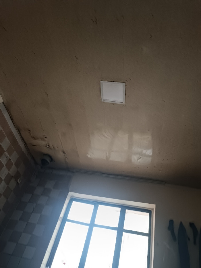 This image depicts an interior scene in Tashkent, Uzbekistan, capturing a ceiling and upper wall sections from a low vantage point. The light brown ceiling surface displays an uneven texture, areas of discoloration, and reflective patches that distinctly mirror the grid pattern of a window. A single square white ventilation cover is centrally installed on the ceiling. The upper left wall is partially covered with a checkerboard pattern of light brown and white square tiles. Below the ceiling line on this tiled wall, a dark circular pipe opening is visible. A large window, featuring a dark multi-pane frame, occupies the lower central and right portions of the image, admitting bright, diffuse light. On the wall section to the right of the window, several dark, elongated textile items are suspended vertically. No individuals or specific actions are observed within the frame.