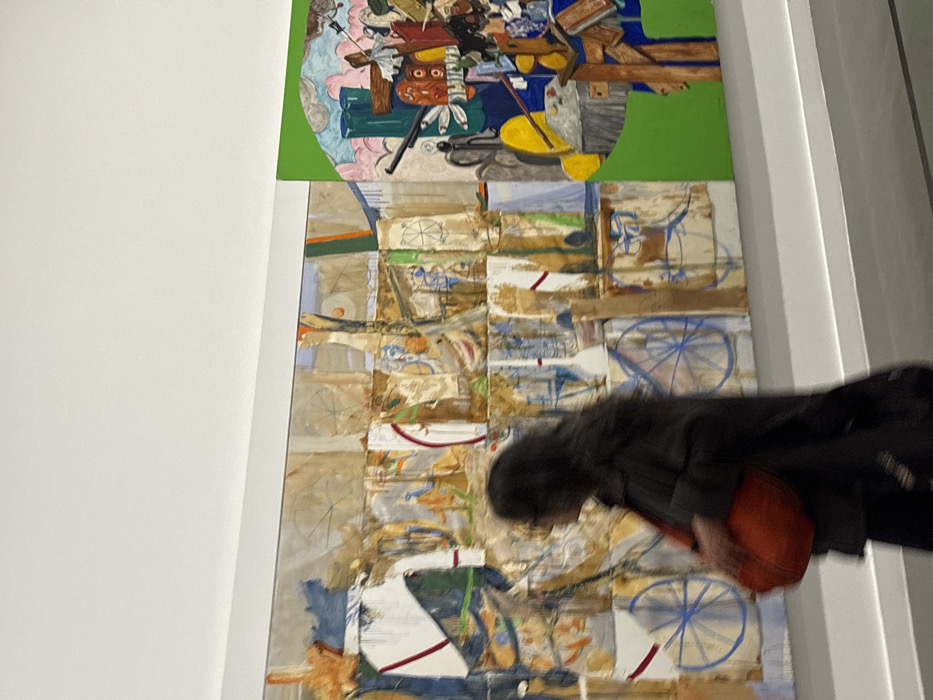 The scene depicts an interior view of an art gallery, likely within the Centre Pompidou in Paris, France. Two large, contemporary artworks are displayed on a pristine white wall under bright, even illumination. The prominent artwork on the left is a multi-panel piece, primarily composed of beige and earth-toned squares and rectangles, overlaid with abstract and semi-abstract elements including blue bicycle wheels, grid lines, and fragmented forms in white, blue, and orange. Adjacent to it on the right is a second artwork featuring a vibrant green, irregular-shaped background, within which an assemblage of colorful, fragmented objects is depicted. These objects include a prominent black gun-like form, blue and green cylinders, a yellow curved object, reddish-orange blocks, and white feathery elements, set against a light blue and pink background suggestive of a sky. An individual with long, dark hair, dressed in a dark coat and carrying a distinctive orange spherical handbag, is captured in motion-blur walking from left to right across the lower foreground, partially obscuring the lower sections of the artworks. A light grey floor or dado rail is visible at the bottom of the frame.