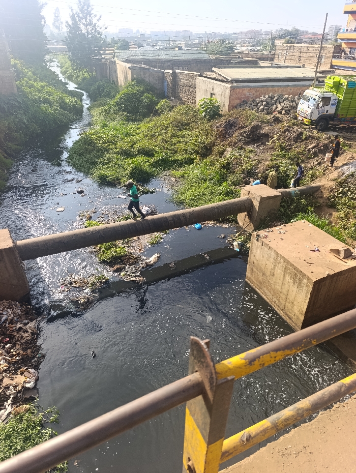 A polluted river flows through a densely populated area. Debris lines the banks and floats in the dark water. A person walks across a large pipe spanning the river. Nearby, other figures stand near a garbage truck. Buildings and vegetation border the river. The view is framed by a yellow-striped railing.
