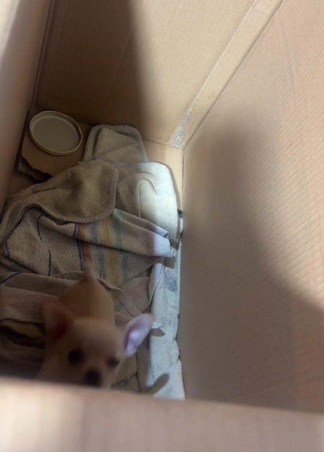 Inside a tall, light-brown cardboard box, a tan-colored Chihuahua puppy is visible on a towel-covered surface