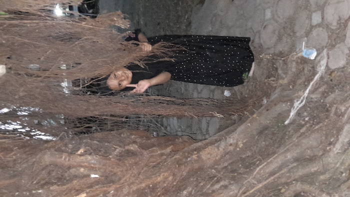 An image shows a person in a black and white polka dot dress lying on their side, making a peace sign with their hand. They are situated within or below a network of organic fibers or roots. The background appears to be a mix of earthy textures and stone structures. The overall composition has a unique, subterranean feel.