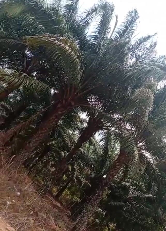 The camera is angled upwards, showing a line of palm trees on a sunny day with some clouds. The trees are green and dense, with thick brown trunks leaning slightly. The ground is a mix of red soil and dry grass. The camera moves slowly along a dirt road parallel to the trees.