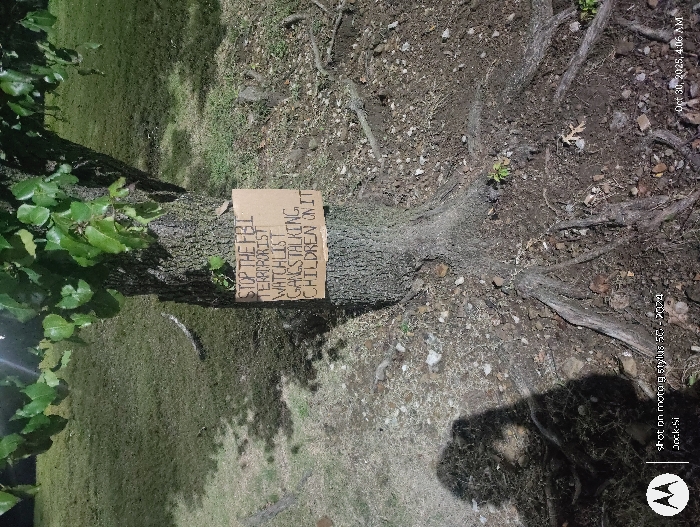 This low-light image, captured on October 30, 2023, at 4:06 AM, depicts a natural outdoor environment described as being in Tulsa, United States. The primary subject is a tree with a rough, textured bark and visible root system extending into the surrounding dirt and scattered debris. Green foliage is visible in the upper portion of the tree. Affixed to the trunk of the tree, approximately mid-frame, is a rectangular piece of light brown cardboard serving as a handmade sign. The sign features handwritten text in dark marker, oriented vertically, which reads: "STOP THE FBI TERRORIST WATCHLIST GANGSTALKING CHILDREN ON IT". The ground cover consists of sparse green grass in the background, transitioning to exposed dirt and small stones around the tree's base and roots in the foreground. A distinct, dark human shadow, likely belonging to the photographer, is cast on the lower-left ground area. The illumination suggests artificial light source, possibly from the camera's flash or a nearby street lamp, creating bright spots on the foliage and ground.