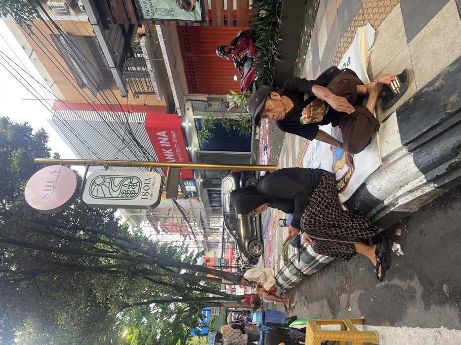 An elderly man in a cap and a woman in a hijab sit on the sidewalk next to a curb, focused on something on the ground. Behind them, a street scene unfolds with parked cars, a motorcycle, and other people sitting on the sidewalk. Signage for businesses is visible, including "SHEA," "ISOIA Coffee & Bistro," and "BANK INA Member of Salim Group." The scene is set in a city with buildings and trees lining the street.