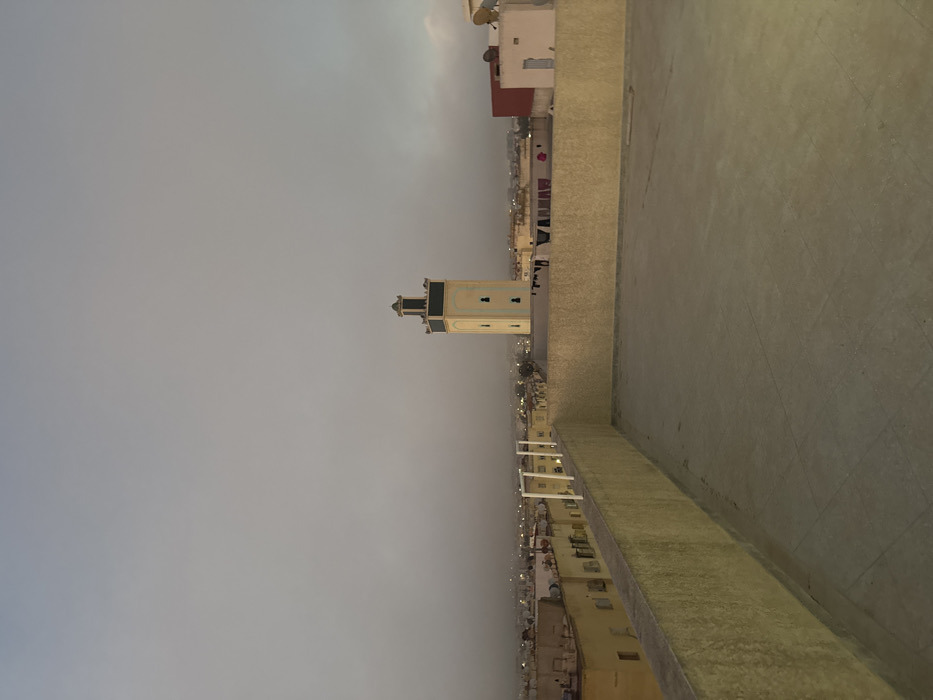 A vertical panoramic captures a townscape beneath a cloudy sky. A tall minaret, adorned with light blue and dark accents, is centrally positioned amidst the buildings. A concrete ledge in the foreground creates depth, while the town extends into the distance, blending beige buildings and streetlights. The overcast sky casts a muted light over the scene.