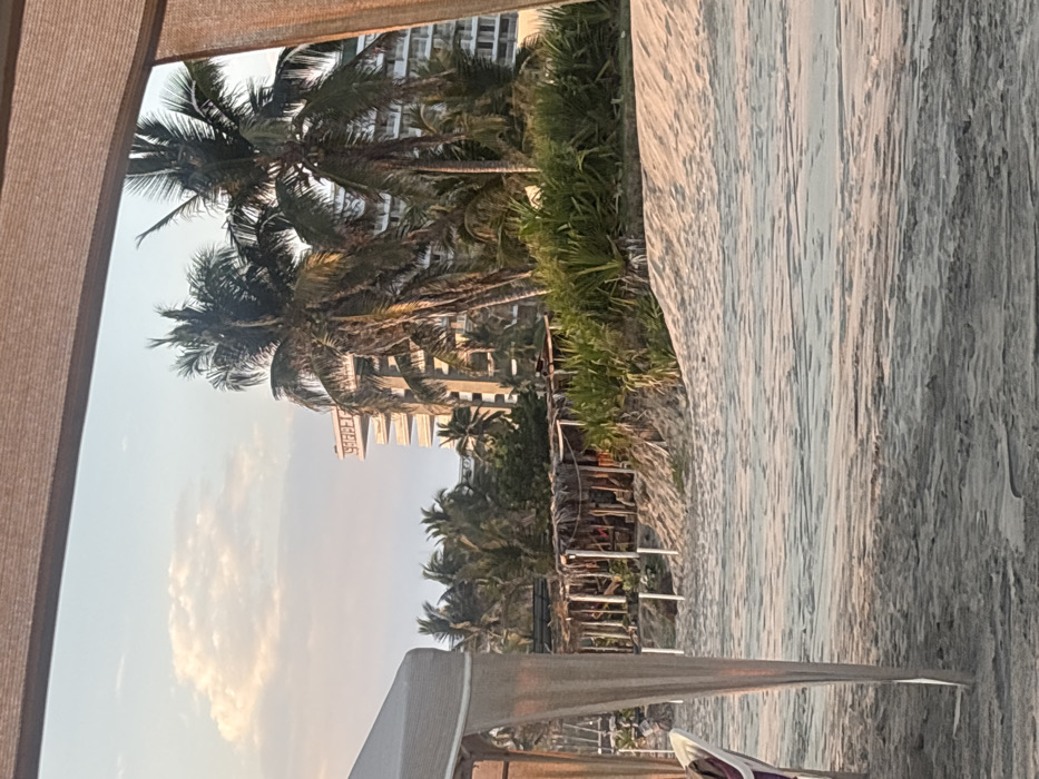 A horizontally oriented view presents a beach scene framed by architectural elements. Palm trees sway against a backdrop of buildings, suggesting a tropical location. A weathered structure, perhaps a beach hut, stands amidst the foliage. The scene is bathed in soft sunlight, creating a serene and tranquil ambiance. A white textured surface occupies the right portion, possibly water or sand. A canopy's edge is visible.