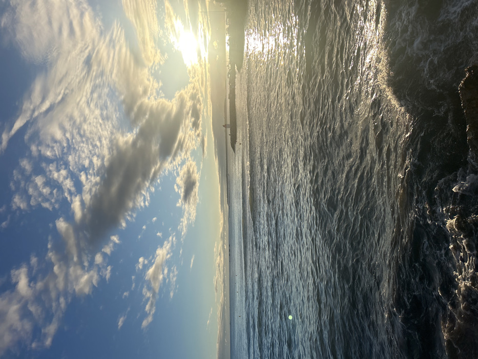 The image presents a coastal scene in Antibes, France, captured during either sunrise or sunset with the sun positioned low on the right, emitting a strong glare. The sky is blue, featuring numerous scattered white clouds and a prominent, dark, elongated grey cloud formation stretching across the mid-upper portion. The lower two-thirds of the frame are occupied by the sea, displaying dark blue-green waters with visible wave activity; waves are breaking into white foam in the immediate lower right foreground. A strong specular reflection of the sun creates a bright, shimmering path across the water surface originating from the right. In the mid-ground, a white lighthouse or beacon is situated on a rocky breakwater extending from the right side of the frame into the water. Faint silhouettes of additional structures or vessels are discernible beyond the beacon against the bright sunlight on the right. No human figures are present. The distant coastline is visible along the left horizon.