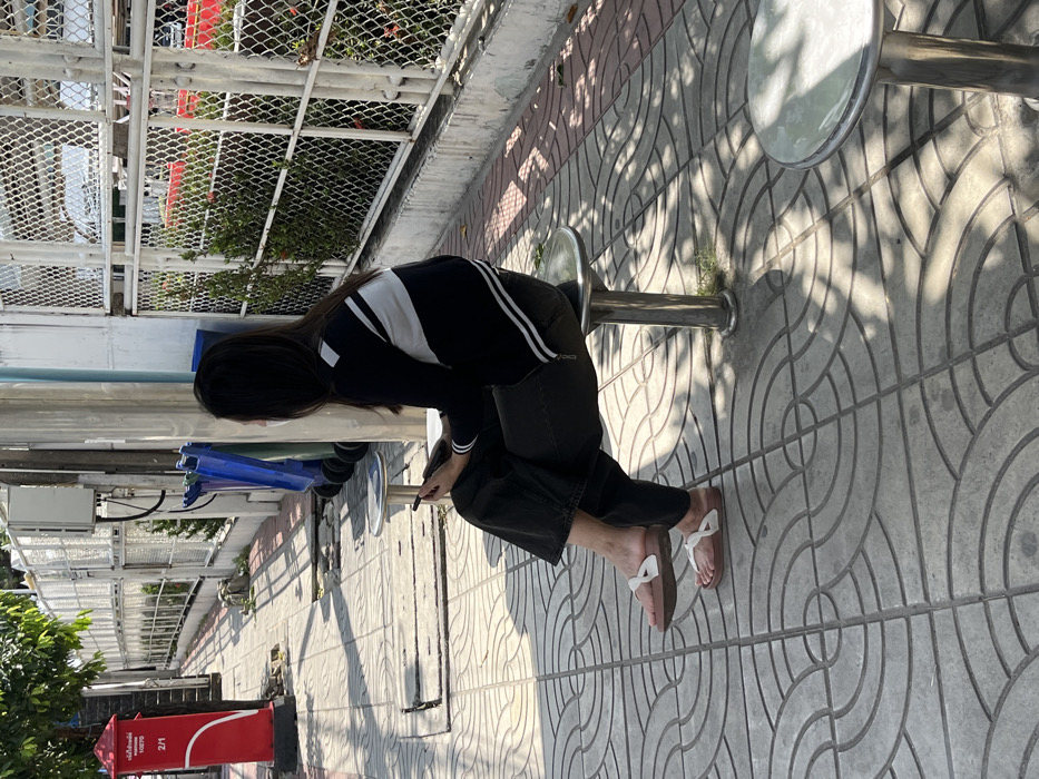 A female individual is seated on a metallic stool on a patterned grey concrete sidewalk in Samrong Nuea Subdistrict Municipality, Thailand