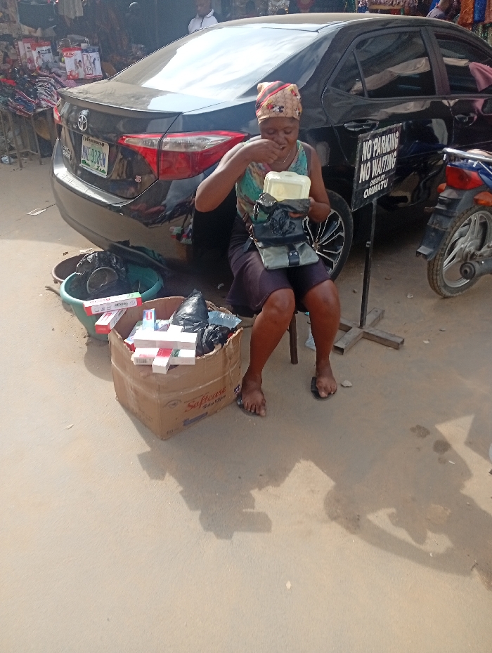 This image captures an outdoor market scene in Fegge, Nigeria. In the foreground, a female individual, appearing middle-aged, is seated on a low, dark stool. She wears a multi-colored, patterned headscarf, a sleeveless patterned top, and a dark skirt. Her left foot is bare, and her right foot wears a dark slipper. She is actively eating from a light-colored rectangular plastic container, holding it in her left hand while her right hand rests on a dark shoulder bag on her lap. To her immediate left, a cardboard box, partially labeled "Softcare baby wipes," is filled with various items for sale, including numerous cigarette packs (identifiable brands like Benson & Hedges, Marlboro, and Dunhill are visible) and black plastic bags. Adjacent to the box, a green plastic basin holds dark, unidentifiable objects. Behind the woman, a black Toyota Corolla sedan is parked, displaying a Nigerian license plate, "NNN-930HV," indicating Cross River State. To the right of the car, a black sign on a wooden post explicitly states "NO PARKING NO WAITING OWNED BY OMONATU" in white lettering. Further to the right, the rear section of a blue and silver motorcycle is visible. The background reveals additional market stalls displaying textiles and packaged goods. The scene is illuminated by bright daylight, casting clear shadows on the light-colored, paved ground. A second individual's head, wearing a white shirt, is partially visible in the distant background behind the car.
