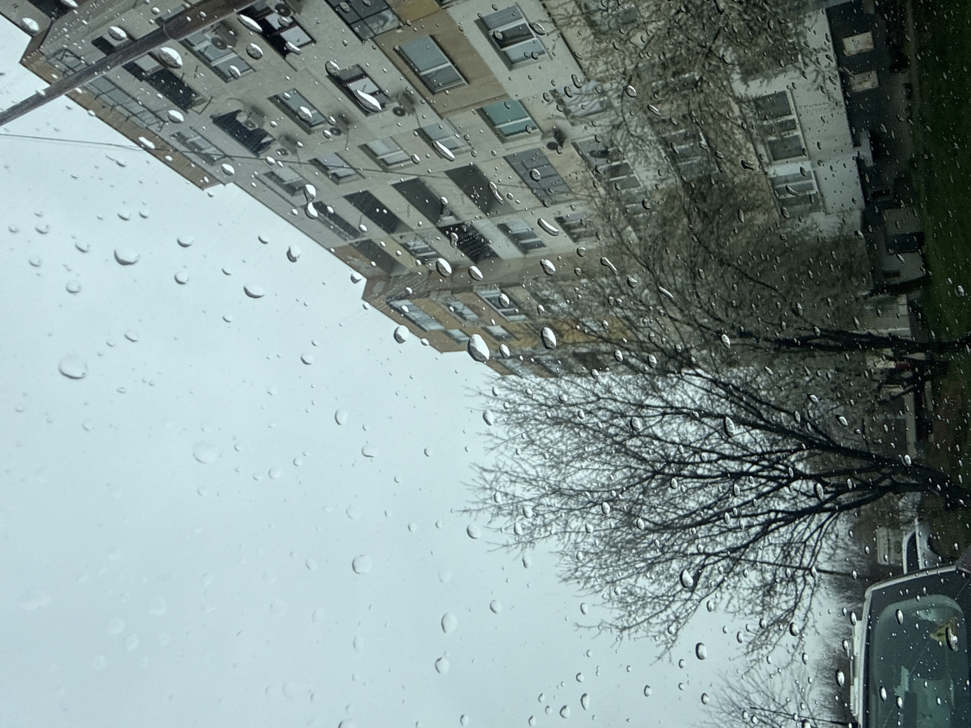 - "The image depicts an urban exterior scene on an overcast, rainy day, viewed through a glass surface heavily covered in water droplets" by FM-YtIYn1, licensed under CC BY 4.0