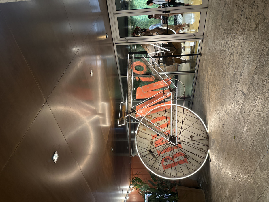 The scene depicts an exterior or semi-enclosed entrance area of a building, located in Cornellà de Llobregat, Spain. The dominant feature is a large, stylized bicycle art installation positioned in the left and central foreground. This installation features a massive, solid front wheel, approximately 1.5 to 2 meters in diameter, which appears to be made of light-colored, possibly wooden material, bearing the distressed orange text "BARIO." The bicycle frame is outlined with bright, white, neon-like illumination, with the smaller rear wheel also detailed by this light. Behind the bicycle, a modern building entrance is visible, composed of multiple glass door and window panels. Through these glass panels, several indistinct human figures are visible inside the building, appearing to walk or stand. The interior also features large, distressed orange letters on a wall, spelling "BARIO," and a textured green wall, possibly artificial foliage, extending further into the background. The ground surface in the foreground is covered with light-toned, rectangular paving tiles with a textured, worn finish. The ceiling above is flat, composed of reflective, possibly metallic, panels, and contains multiple recessed square light fixtures. Reflections of the bicycle's neon light and the internal lighting are visible on the ceiling panels. To the far left, two large potted plants with green foliage are present. The overall lighting suggests dusk or nighttime.