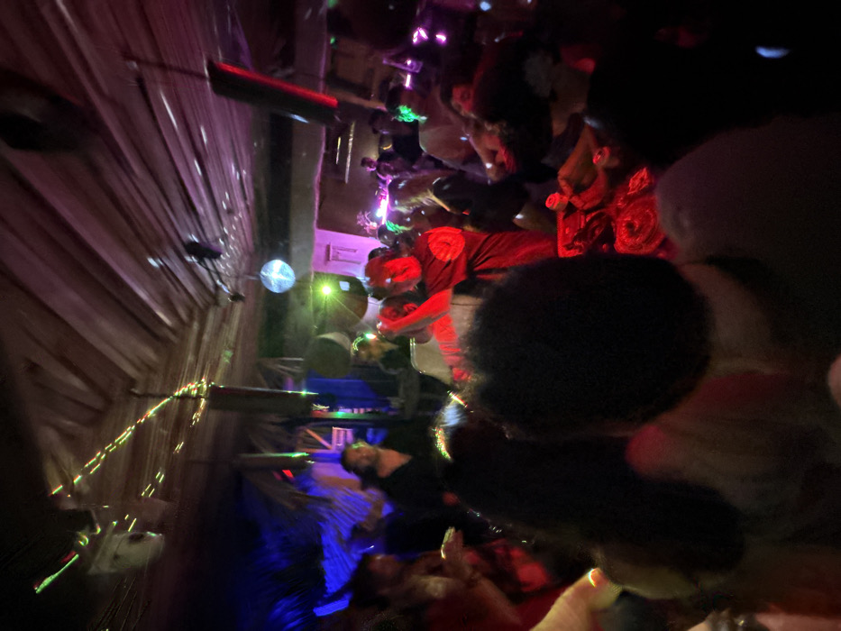 The image depicts an indoor nocturnal gathering located in Brisas de Zicatela, Mexico