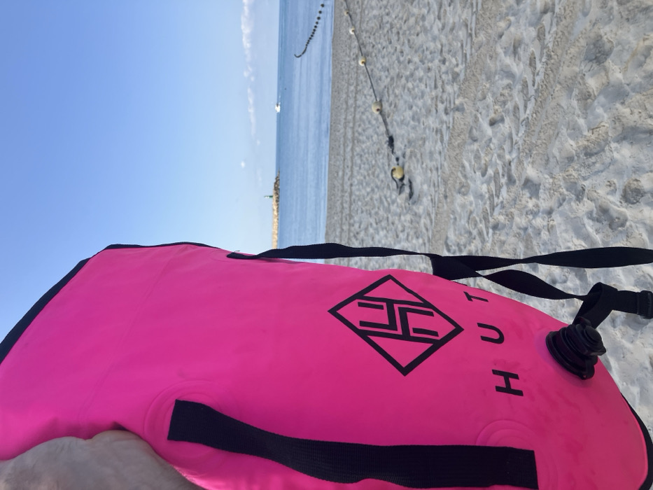 - "A close-up, high-angle view depicts a person's left hand holding a prominent, bright neon pink inflatable dry bag or swim buoy in the immediate foreground, obscuring part of the right side of the frame" by FM-K790o1, licensed under CC BY 4.0