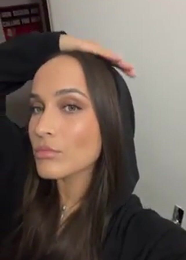 A woman wearing a black hooded sweatshirt stands in front of a white door. She poses by putting her right hand on her head and making a kissy face at the camera. She makes the kissy face again and holds up a hand making a peace sign.