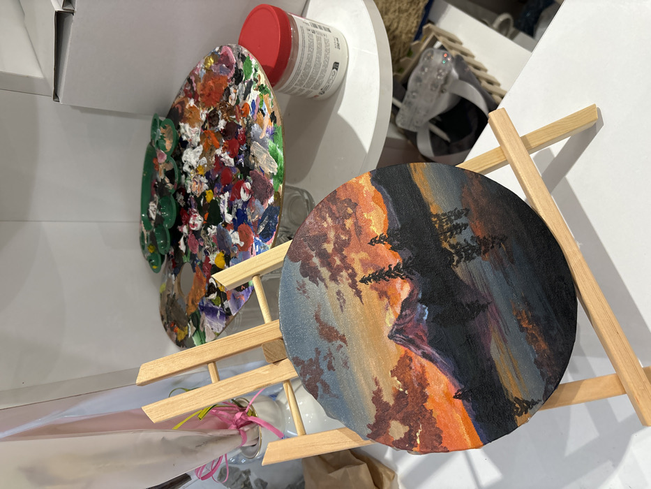 The image depicts an indoor art studio or creative workspace in Sofia, Bulgaria. The central subject is a circular canvas painting, approximately 20-30 cm in diameter, displayed upright on a light wooden tabletop easel. The painting illustrates a vibrant sunset or sunrise landscape featuring a large mountain silhouetted against an orange, red, and yellow sky with dramatic clouds. Evergreen trees are visible on the dark, undulating foreground landscape, which appears to include a body of water reflecting the sky's colors. Behind and to the right of the easel, on a white surface, an oval artist's palette is present, heavily covered with numerous dried and mixed paint colors, indicating recent use. Behind this, a smaller green plastic palette with multiple wells is partially visible. To the far right, a white jar with a red screw-top lid, labeled "250 ml," contains an art medium or paint. To the left of the easel, a white vase holds several wrapped items, possibly flowers or art supplies, secured with a pink ribbon. A brown paper bag is partially visible on the far left. The objects rest on a white shelf or table, with another white shelf visible above and a lower shelf below, where a light-colored woven basket contains indistinct items, including what appears to be a clear, reflective object. No people are visible in the scene. The environment is orderly, suggesting a dedicated space for artistic creation.