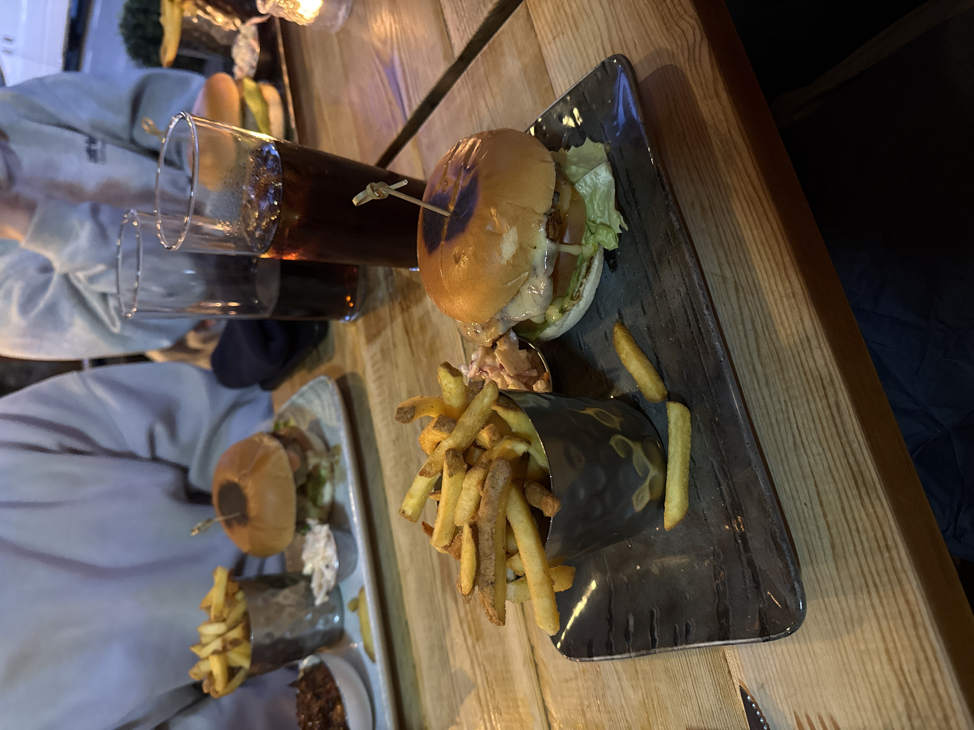table in a dimly lit setting, possibly a restaurant or pub. On the table, there are two plates of food. Each plate contains a burger and a serving of fries presented in a decorative metal holder, along with what appears to be a side of coleslaw. A skewer holds the burger together. Next to one of the plates are two glasses filled with a dark liquid, likely a beverage. Two people are partially visible in the image, one wearing a light grey top. The table itself has a wooden surface. Given that the user is asking for the location in Windermere, United Kingdom, I can only assume that the location of the food and people are somewhere in Windermere, United Kingdom. I don't have any other information to indicate a specific restaurant name, or location.