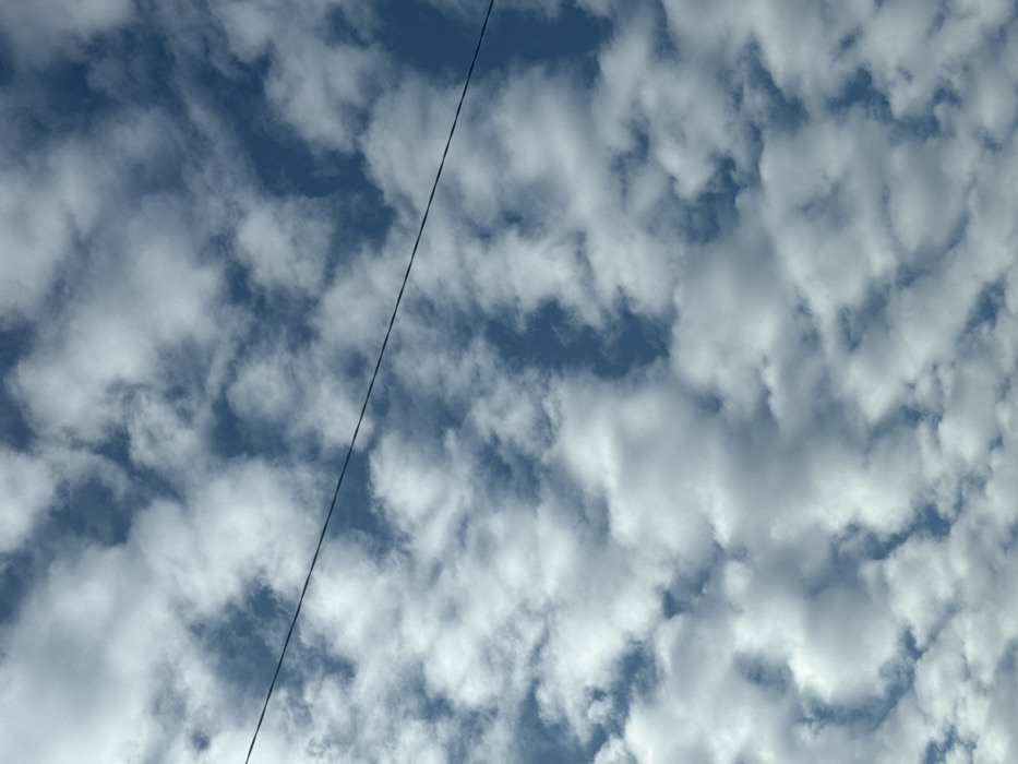 A partly cloudy sky dominates the view. White, fluffy clouds are scattered across a blue background. A thin, dark cable or wire cuts diagonally across the frame, adding a stark contrast to the otherwise soft, natural scene. The sky appears bright and airy, suggesting a daytime setting.