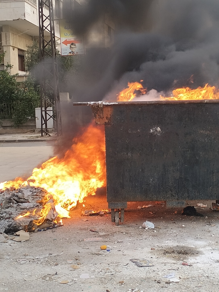 - "A large metal dumpster is engulfed in flames on a dusty, debris-strewn ground in Ad Duwayr, Syria" by FM-4RDN43, licensed under CC BY 4.0