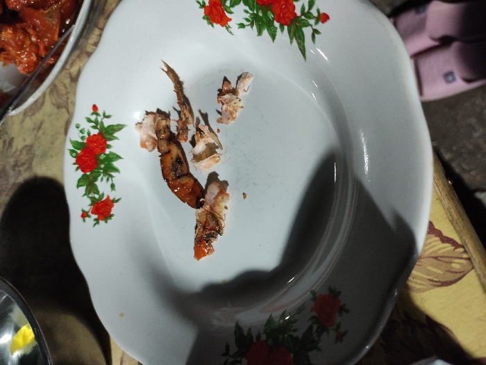 white plate with a floral pattern containing the remains of a crab. The plate is sitting on a light-colored table with a blurry background. There are multiple pieces of crab, including a shell, claws, and legs. The plate is mostly empty with the remaining crab pieces scattered on the plate. The image appears to have been taken indoors, possibly in a home or restaurant. The location, based on the provided coordinates, is in Kecamatan Buduran, Indonesia.