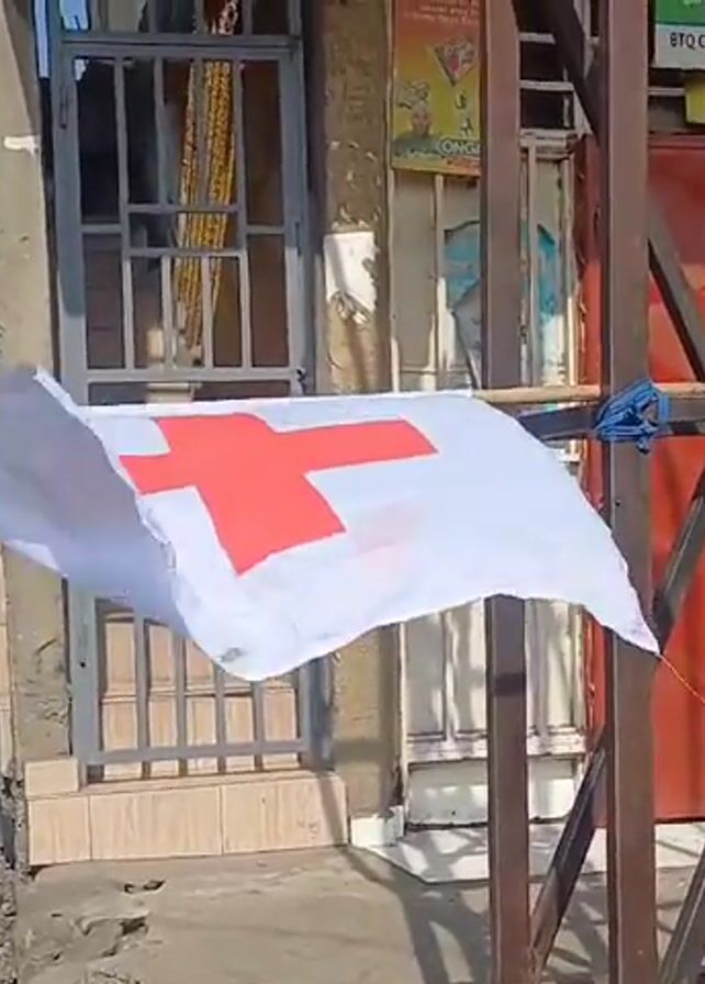 A white flag with a red cross on it is displayed in front of a building. The flag is hanging from a metal structure. The building has a metal gate and a red wall. The surrounding area looks like a marketplace with other buildings and people visible in the background. The ground is uneven and littered with debris. The sky is blue.