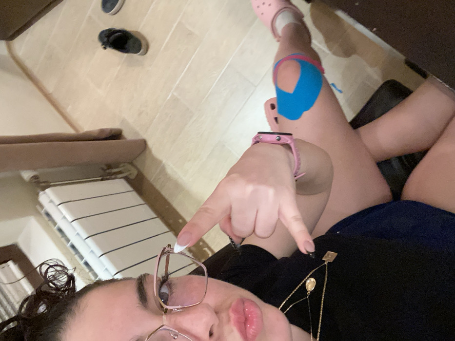 The image displays an indoor scene located in Bansko, Bulgaria. A young female individual is partially visible, captured in a close-up, high-angle selfie. She has dark, curly hair and wears pink-framed glasses. Her left hand is raised, performing a "shaka" gesture, with a French tip on the extended index finger and dark polish on other visible nails. A pink watch with a stud-detailed strap is on her left wrist. She wears a black t-shirt and layered gold necklaces, one with an oval charm and another with a square charm. Her lips are pursed. The subject's right leg is prominent, revealing light pink and blue kinesiology tape applied to the knee. A light pink Croc-style sandal is on her right foot. The background consists of light wood-patterned flooring, a white, multi-finned radiator positioned beneath a window, and a light brown curtain. Two dark shoes are visible on the floor in the mid-right portion of the frame.