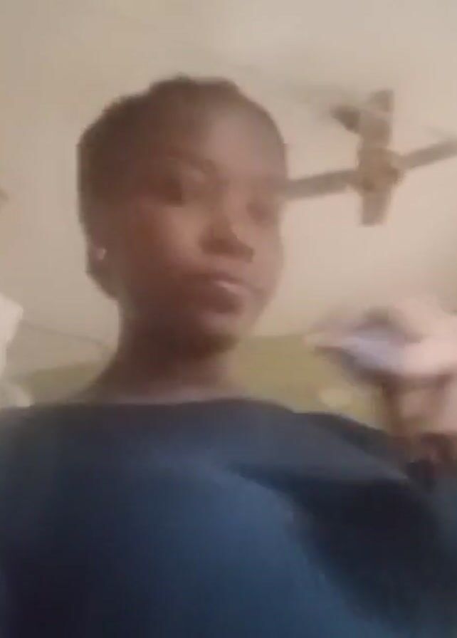 A woman is filmed from the chest up, standing in what appears to be a room with a ceiling fan
