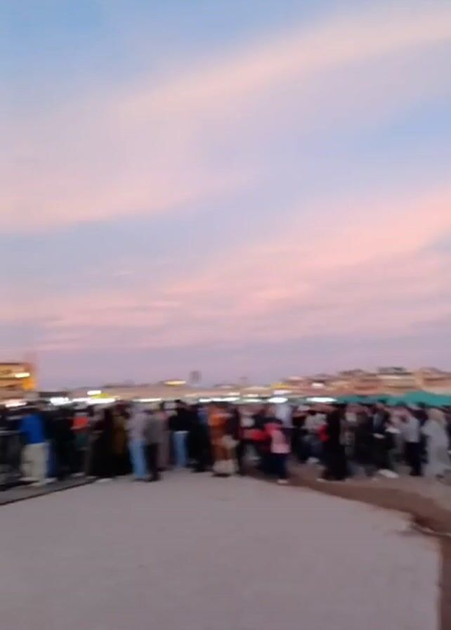 crowd of people gathered in an outdoor space under a sky painted with hues of pink and blue at dusk or dawn. The crowd appears to be behind a metal barrier, possibly for an event or gathering. Red flags are interspersed along the barrier. The ground is paved and there's a strip of darker material, possibly dirt or sand, running along the bottom of the frame. In the background, buildings with lights on can be seen. The video appears to be handheld, and there is some camera shake.