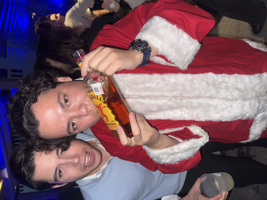 Two men pose closely for a photo. One in a Santa suit holds a bottle of Fireball whisky near his mouth, while the other, wearing a light blue sweater, smiles. A drink in a clear cup is visible in the bottom right. A group of people are dimly lit in the background, one wearing a white shirt. Blue ambient lighting is present on the left. The man in the Santa suit wears a large dark watch with a blue band.