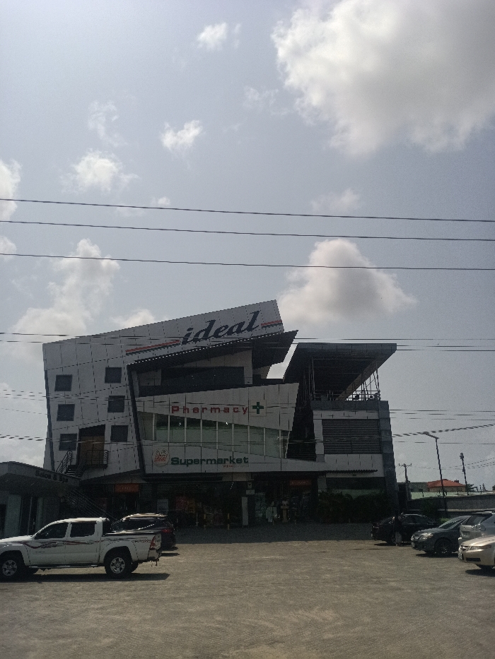 This image displays a modern, multi-story commercial building in an Unknown city, Unknown country. The building features an angular, asymmetrical architectural design with white and gray paneling and dark-tinted windows. A prominent sign at the top reads "ideal." Below this, on a middle floor, is a "Pharmacy" sign with a green cross symbol. Further down, a "Supermarket" sign is visible, and a partial sign for "Salon & Spa" is on the lower left. The foreground consists of a paved parking lot. A white four-door pickup truck is parked on the left, and several sedans, predominantly dark-colored, are parked on the right. Multiple individuals are visible near the ground-level entrances of the Supermarket and Pharmacy sections. The sky overhead is partly cloudy, traversed by three horizontal power lines. Streetlights are visible on the right side of the parking lot, and distant residential structures with orange roofs are faintly present in the background. The scene is illuminated by natural daylight.