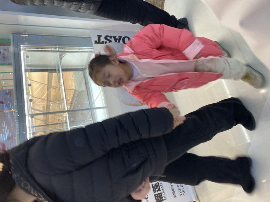 The image captures an indoor scene in the city of Taihe District, China. A young female child, wearing a pink puffer coat over a lighter pink top and light-colored pants, is observed walking forward while holding the right hand of an adult whose upper body is out of frame to the left. The child's facial expression indicates distress, with eyes closed and mouth open in a crying gesture. The adult on the left is dressed in a dark puffer jacket, dark pants, and dark shoes; a small emblem is visible on the jacket's left sleeve. A second adult's lower right leg and foot are partially visible on the far right. In the background, an empty, brightly illuminated glass display case featuring multiple shelves is present. A white vertical sign with "DURIAN" and other text is partially visible to the left. To the right, another white sign displays the partial word "OAST" and a blurred image of a large, round pastry. The floor is light-colored and reflective. All visible subjects appear to be in motion.